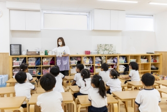 プチ園で0、1、2歳は合同で、3歳児からは挨拶や名前、色、天気、動作など英語で答えられるようにレッスンを受けています。英語の歌も歌えるようになりました。